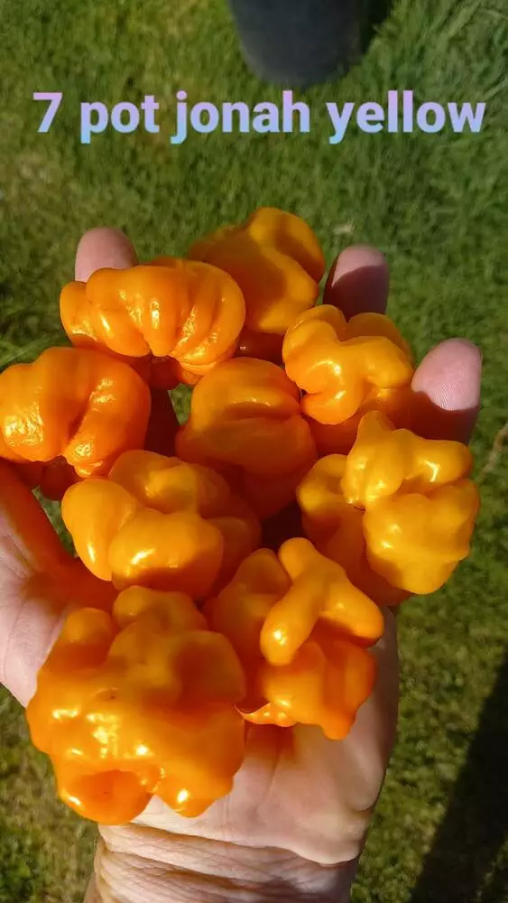 Небольшое растение сорта Capsicum Chinense, 7 Pod Jonah Yellow вырастает в горшке до чуть менее метра и становится еще больше, если его посадить в землю. Стручки чили напоминают хабанеро, созревая от зеленого до ярко-желтого цвета.