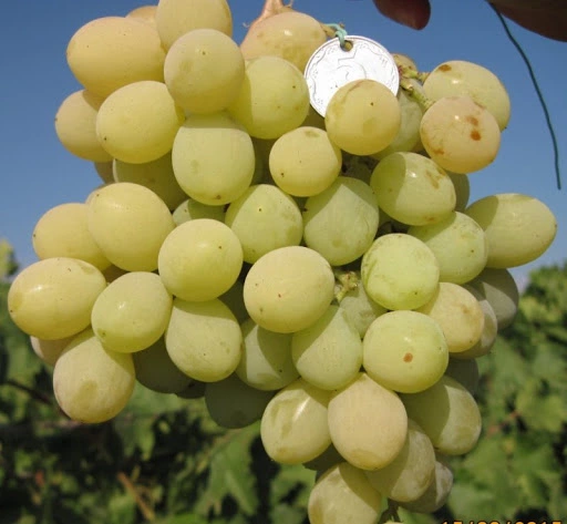 Виноград "Афродита" отличается крупным размером кистей. Расположение плодов рыхлое. Масса одной грозди обычно составляет 600-900г. Ягоды крупные, средний вес одной ягоды – 7,5г, форма слегка вытянутая. Мякоть имеет светлый цвет и хрустящую консистенцию, в ней содержится большое количество сока. Вкусовые качества достаточно высокие. Концентрация сахара в виноградном соке данного сорта – 16%. Содержание кислот – 6г/л. Гроздья и ягоды имеют хороший товарный вид, отлично переносят транспортировку. Холодостойкость довольно низкая, ограничивается температурой –20°С. Во избежание замерзания кустов им требуется укрытие. С момента распускания первых почек до достижения окончательной спелости плодов проходит обычно от 110 до 115 суток.
