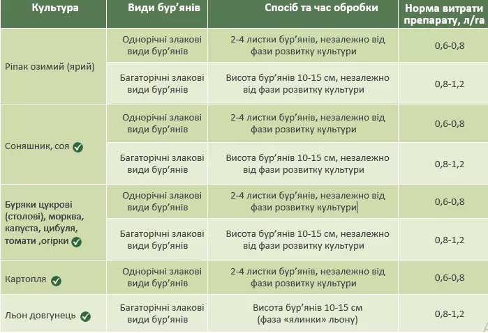 - Обприскування посівів за висоти бур’янів 10-15 см, фаза "ялинки" льону проти багаторічних злакових видів бур’янів - норма витрат 0.8-1.2 л/га