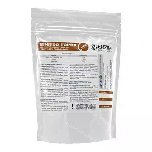 BiNitro Горох СФ — сухий препарат для передпосівної інокуляції насіння гороху, бобів, сочевиці, вики на основі культури бульбочкових бактерій Rhizobium leguminosarum та продуктів їх метаболізму.