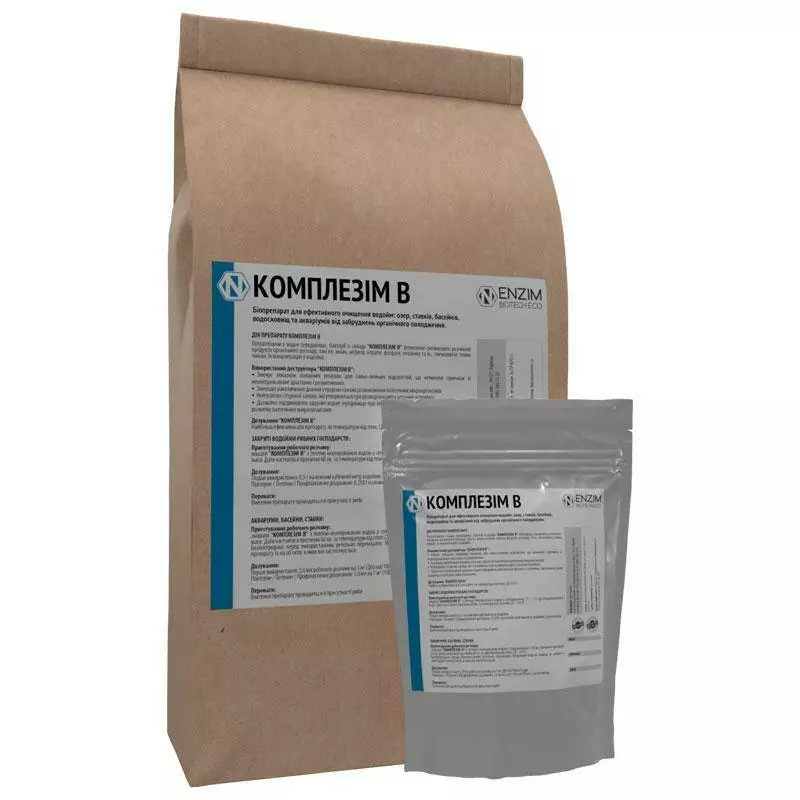 Біодеструктор Комплезім В - біопрепарат для ефективного очищення водойм: озер, ставків, водосховищ, басейнів та акваріумів від забруднень органічного походження, для зменшення вмісту органічних речовин, розчинених у води, різноманітних сполук азоту, за рахунок чого у води зменшується вміст метану, сірководню тощо.