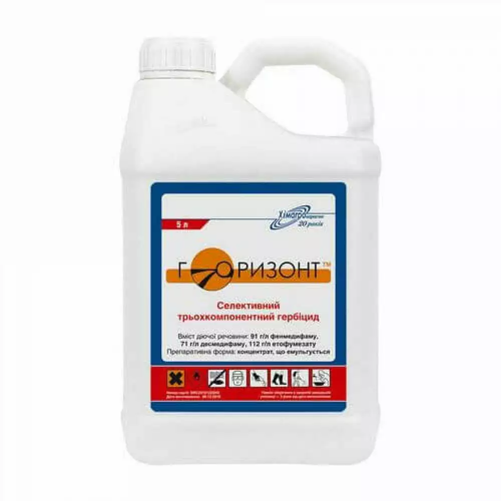 Гербицид Горизонт - Цена, как Купить и Инструкция Гербицид Горизонт - селективный трехкомпонентный листовой и почвенный, гербицид для борьбы с однолетними двудольными и некоторыми злаковыми сорняками при выращивании сахарной, кормовой и столовой свеклы. Действующее вещество: фенмедифам, 91 г/л, десмедифам, 71 л/л, этофумезат, 112 г/л Химический класс: фенилкарбоматы и бензофураны Препаративная форма: концентрат эмульсии (КЭ) Упаковка: канистры, 5 л Скорость действия: Видимые симптомы действия препарата появятся через 3-4 суток. Гибель сорняков наступает через 7-10 суток. Механизм действия: Проникая в растения препарат нарушает фотосинтез и обмен белков в клетках сорняков, замедляет рост меристемных тканей и деление клеток. Высокая температура воздуха (до 25 °С) и интенсивное солнечное излучение усиливают его действие. Свойства и преимущества гербицида Горизонт: Имеет широкий спектр действия против однолетних двудольных сорняков и некоторых злаковых на посевах сахарной, столовой и кормовой свеклы. Решает проблему борьбы с такими трудноискоренимыми сорняками в посевах сахарной свеклы, как лебеда бела, сорняков семьи крестоцветных, щирица, горца (виды) и др. Отсутствующее ограничение по фазам развития сахарной свеклы. Обладает высокой селективностью. Проведение обработок до смыкания в междурядьях — поддержка конкурентоспособности культурного растения. На действие препарата мало влияют почвенно-климатические условия. В отличие от обычных баковых смесей все три компонента действующего вещества Горизонта содержатся в каждой капле рабочего раствора. Имеет в своем составе ПАВ, которые позволяют лучше покрывать и дольше содержаться на листовой поверхности сорняков. Прекрасно соединяется с другими гербицидами для усиления действия против определенной группы сорняков, тем самым решает индивидуальные проблемы защиты конкретного поля. Удобная в использовании форма препарата. Экологически безопасный — действующие вещества в почве полностью разлагаются на протяжении двух месяцев. Классификация ВООЗ, токсикологическая характеристика: ІІІ класс (умерено-токсичные). Срок пригодности и условия хранения препарата: Три года в закрытой заводской упаковке при температуре от +5 °С до +35 °С. Вредные объекты: Высокочувствительные: горей вьюнковый, горец почечуйный, пастушья сумка, дурман обыкновенный, крестовник весенний, звездчатка средняя,крапива глухая стеблеобемлющая, лебедовые (виды), лутига развесистая, мак дикий, паслен черный, подмаренник цепкий, портулак огородный, спорыш обыкновенный, ярутка полевая, фиалка полевая, щирица обыкновенная. Среднечувствительные: овес обычный, лютик полевой, щетинник (виды), дурнишник (виды), пальчатка (виды), ежовник обыкновенный, просо (виды), ромашка (виды), чина клубневидная, щирица белая, щирица лободовидная. Стойкие: горошек мышиный, пырей ползучий, ромашка лекарственная, cвинорой пальчатый. Прменение и норма расхода гербицида Горизонт Сахарная свекла Норма расхода: 1,0-3,0 л/га Вредный объект: однолетние двудольные и некоторые злаковые сорняки. Норма расхода рабочей жидкости: 250-400 л/га. Способ и время обработки: опрыскивание до смыкания междурядий. Свекла столовая*, кормовая* Норма расхода: 1,0-3,0 л/га Вредный объект: однолетние двудольные и некоторые злаковые сорняки. Норма расхода рабочей жидкости: