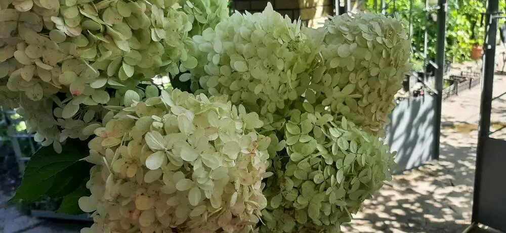 Hydrangea paniculata 'Phantom', Гортензия метельчатая 'Фантом' синонимы, другие названия: Гортензія волотиста 'Phantom', Гортензія мітловидна 'Привид', Голтензія метельчата Фантом, Гортензия метельчатая Призрак Гортензия Фантом - это морозостойкий, лиственный, многолетний и красиво-цветущий кустарник. Отличается Фантом своей высотой, пышным цветением, прочными побегами и широко-пирамидальными соцветиями. Этот сорт гортензии метельчатой имеет большую, раскидистую крону. Устойчива к болезням и хорошо переносит обрезку. Купить укоренившиеся сажанцы в горшке Гортензии метельчатой Фантом вы можете в питомнике Зеленые Ангелы с доставкой по Украине Как выглядит и растет Гортензия метельчатая 'Phantom': Вырастает максимально в высоту гортензия Фантом до 2-2,5 м, а ширину может разрастаться до 1,5-2 м. Форма куста округлая и раскидистая. Крепкие побеги растут вертикально и имеют коричнево-красную окраску. Листья гортнзии Фантом имеет удлиненную, яйцевидную форму с заостренными кончиками. Цвет зеленый. Соцветия метельчатые, конусной формы. Состоит из многих маленьких цветочков бледно-зеленого или белого цвета в начале лета. Ближе к осени соцветия Фантом приобретает розовой окраски. Размером может достигать 30-50см. Гортензия метельчатая 'Phantom' - как сажать и ухаживать: Метельчатая гортензия Фантом лучше всего растет в хорошо дренированных, кислых, увлажненных и плодородных почвах. Любит солнечные места, но хорошо растет и в полу тени. Вообще Фантом не прихотливый, цветущий кустарник и может расти в любых почвах при условии достаточного количества влаги. Для того чтобы ваш куст гортензии Фантом имела плотную крону и красивую форму рекомендуется проводить сезонные стрижки. Стрижку гортензии лучше проводить весной или уже в конце периода цветения. Гортензия метельчатая 'Phantom' - где сажать: . Метельчатые гортензия Фантом хорошо подходит для городского озеленения в скверах, парках, школьных и городских двориках. Очень красиво выглядит Фантом в одиночных посадках, или можно образовывать цветущие живые изгороди. Также хорошо сочетается в композициях с другими хвойными и лиственными растениями. Сорт гортензии Фантом часто используют в контейнерных посадках для озеленения террас и балконов. А еще благодоря своим декоративным качествам гортензию Фантом можно формировать в небольшое цветущее деревце.
