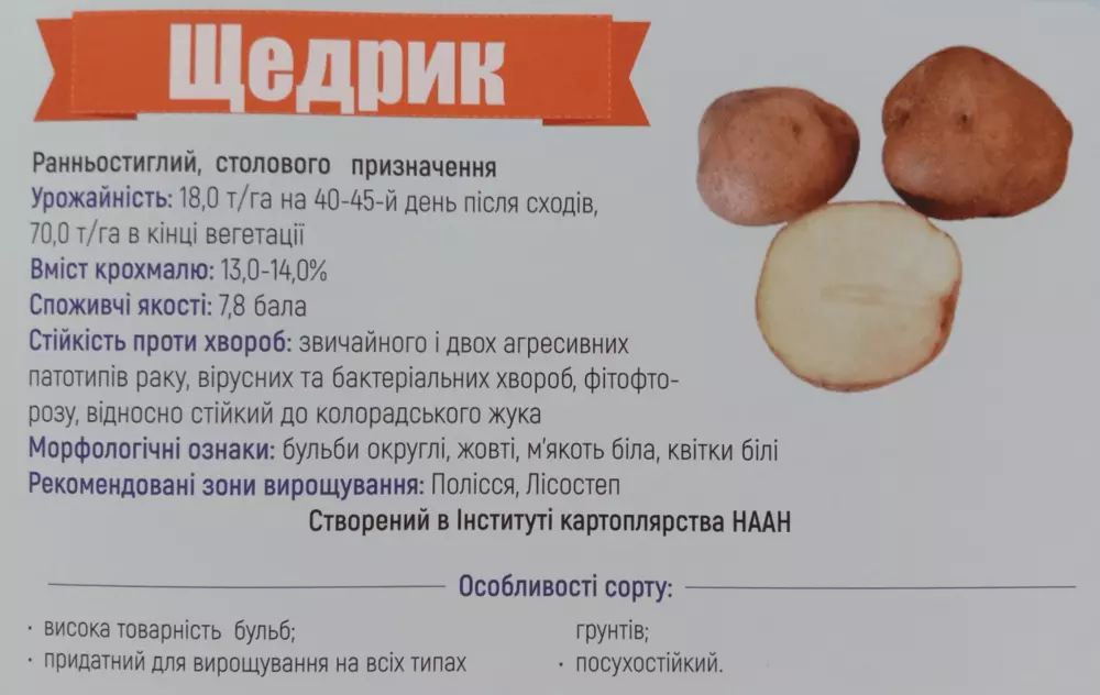 Загальна характеристика: ранньостиглий столовий сорт картоплі української селекції. Пристосовується до грунту і клімату, відрізняється високою врожайністю і посухостійкістю. Період дозрівання(вегетація) : 65-75 днів. Зміст крохмалю : 13-14%. Маса товарних бульб(грам) : 120-150 грам. Кількість бульб в кущі: 6-10 штук. Врожайність(ц/га) : до 620. Споживчі якості: добрий і нормальний смак, м'якуш щільний, добре розварюється і не темніє при нарізці і термічній обробці. Недолік - великі бульби мають глубокозалегающий верхнє очко. Кулінарний тип AB, підходить для супів, запікання і жаріння. Лежкость(здатність до зберігання) : 94%. Колір шкірки : жовтий. Колір м'якуша : білий.