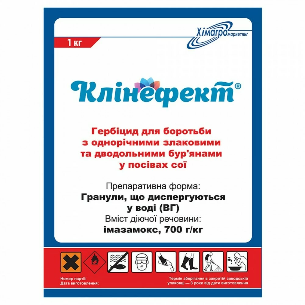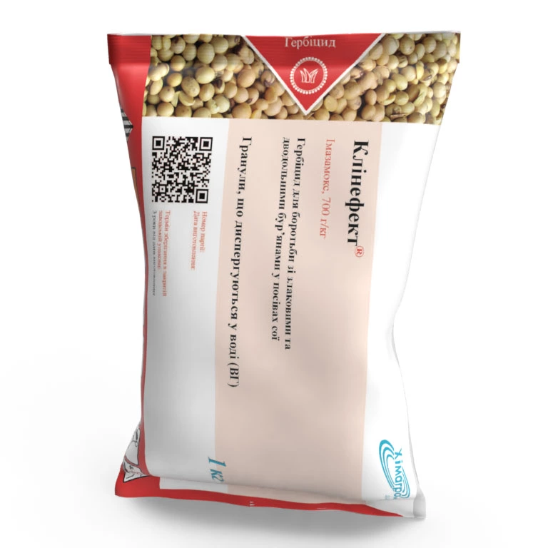 Клинэффект гербицид — Высокоэффективный гербицид для борьбы с однолетними злаковыми и двудольными сорняками в посевах сои. Действующее вещество: имазамокс, 700 г/кг Препаративная форма: водорастворимые гранулы (ВГ) Химический класс: имидазолиноны Упаковка: флаконы, 1 кг
