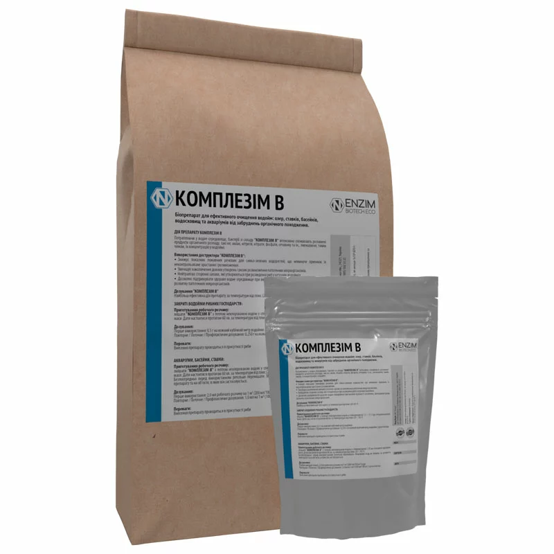 Біодеструктор Комплезім В - біопрепарат для ефективного очищення водойм: озер, ставків, водосховищ, басейнів та акваріумів від забруднень органічного походження, для зменшення вмісту органічних речовин, розчинених у воді, різноманітних сполук азоту, за рахунок чого у воді зменшується вміст метану, сірководню тощо.