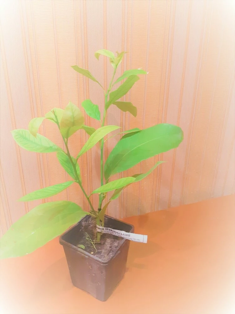 Лимон "Павловский". Взрослое растение достигает 0,8-1,4 м в высоту. Имеет округлую крону 0,6-1,2м в диаметре с 2-4 скелетными ветвями. На молодых побегах кора темно-зеленого цвета, взрослые ветки имеют оливково-серую кору с продольными трещинами. Практически все Павловские лимоны имеют острые колючки на ветвях длиной 1-1,5 см. Листья крупные 12-14 см длиной, с клиновидным основанием и длинной заостренной верхушкой. Форма различная, в зависимости от вида может быть широкоовальной, продолговатой, овальной, широколанцетной или обратнояйцевидной. Листья яркие, блестящие зеленого или темно-зеленого цвета. Черешок короткий, с небольшим желобком. Следует знать, что Павловские лимоны скидывают периодически старую листву. Однако специалистами установлено, что в кроне здорового деревца на каждый плод должно приходиться не менее 8-12 физиологически активных листьев. Следует знать, что Павловские лимоны скидывают периодически старую листву. Однако специалистами установлено, что в кроне здорового деревца на каждый плод должно приходиться не менее 8-12 физиологически активных листьев. Плодоношение начинается с 3-4 года после укоренения. Цвести лимон может и раньше, но в таком случае следует удалять цветки, давая растению возможность укорениться и окрепнуть. Урожайность средняя, около 6-8 лимонов ежегодно. Качество плодов высокое. Сроки вызревания в зависимости от освещения составляют от 35-40 дней до 2,5-3 месяцев.Цитрусовые при транспортировке испытывают стресс, поэтому лист может сохнуть и скручивается. Но это не значит что саженец погиб. Новый лист появится из почек. Так же нельзя обрезать корни и использовать укоренители. Рекомендуется использовать "Эпин" и "Циркон" после перевалки в горшок.