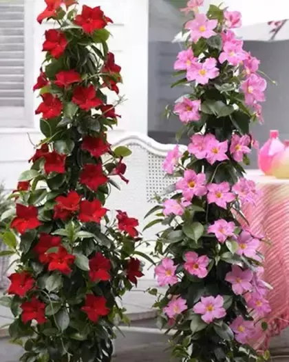 Дипладенія — це швидкорозтяжна ліана, яка стрімко витягується вгору та має деревне стебло з яскраво-зеленим шкірним листям. Всередині листових пластин міститься білий отруйний сік. У домашніх умовах рослина вирощують у формі куща, багато диких видів не підходять для домашнього розмноження. Квіти рослини досить великі, у діаметрі досягають 10 см. Якщо правильно доглядати за ліаною, вона може досягти фантастичних 4-5 метрів заввишки. Лійкоподібні квіти бувають білі, червоні та рожеві — залежно від сорту. На дулі може одночасно перебувати понад 80 квіток, які не в'януть приблизно тиждень. У домашніх умовах багато вирощують дипладінню, як кучерява або ампельна рослина. Нові пагони зазвичай виростають до 3 метрів завдовжки та формуються дуже просто. Найповільніше цвітіння доводиться на літню пору. Свою назву мандевілла дістала завдяки лусочкам у зав'язі.