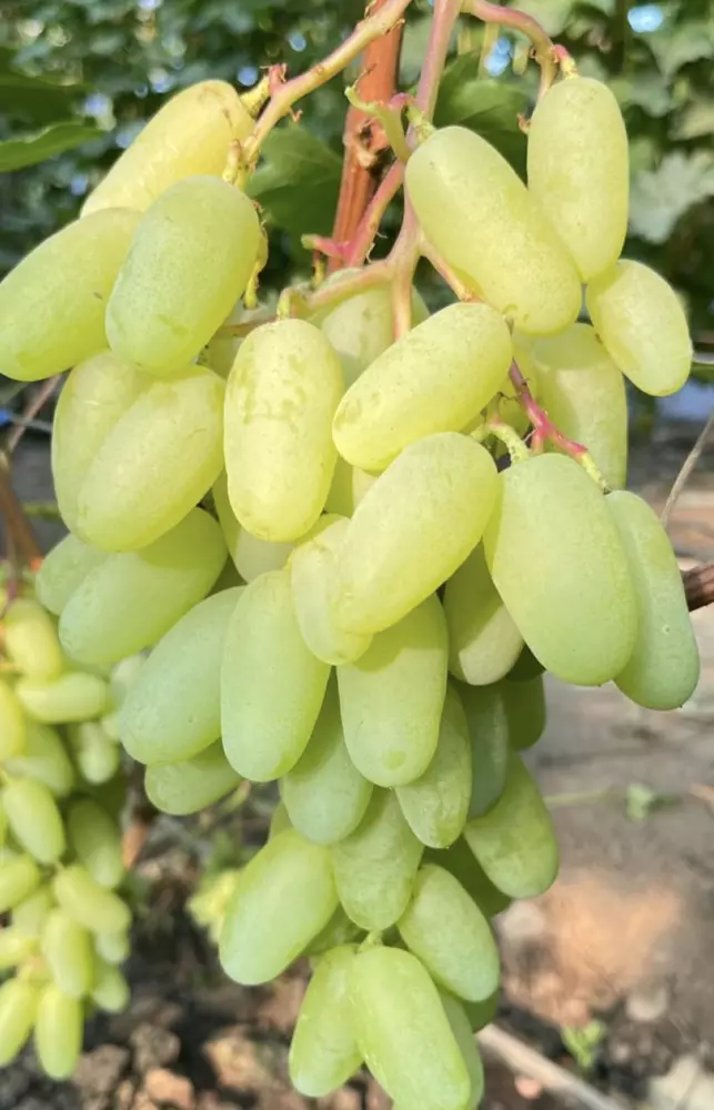 Ягоди пальцеподібні, жовті, на сонці можуть злегка засмагати. Смак гармонійний. На початку дозрівання відчутний легкий мускат, але при накопиченні цукру він зникає. М’якоть щільна, м’ясиста, хрумка. Шкірочка тоненька, не відчувається при їжі. Кісточок дуже мало (2-3). Розмір ягід – 4,5-5 сантиметрів, маса – 16-18 грам. Кущі високі з великою силою росту. Лоза добре та рано визріває.