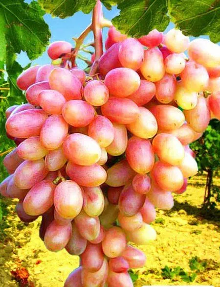 Эксклюзив! Виноград желто-розовый "Шафрановое утро" – это сложный межвидовой гибрид раннего срока созревания (100–110 дней) любительской селекции, очень раннего срока созревания. В корнесобственной и привитой культуре сильнорослый с очень высокой пасынкообразовательной способностью. Цветок обоеполый. Грозди конические или бесформенные, средней плотности, иногда рыхлые, массой 700-1500г. Ягоды очень красивые и крупные, удлиненно-овальные, очень крупные, длинной до 50мм, средней массой 18-20г розовые, гармоничного вкуса. Мякоть сочно-мясистая, кожица средней толщины.