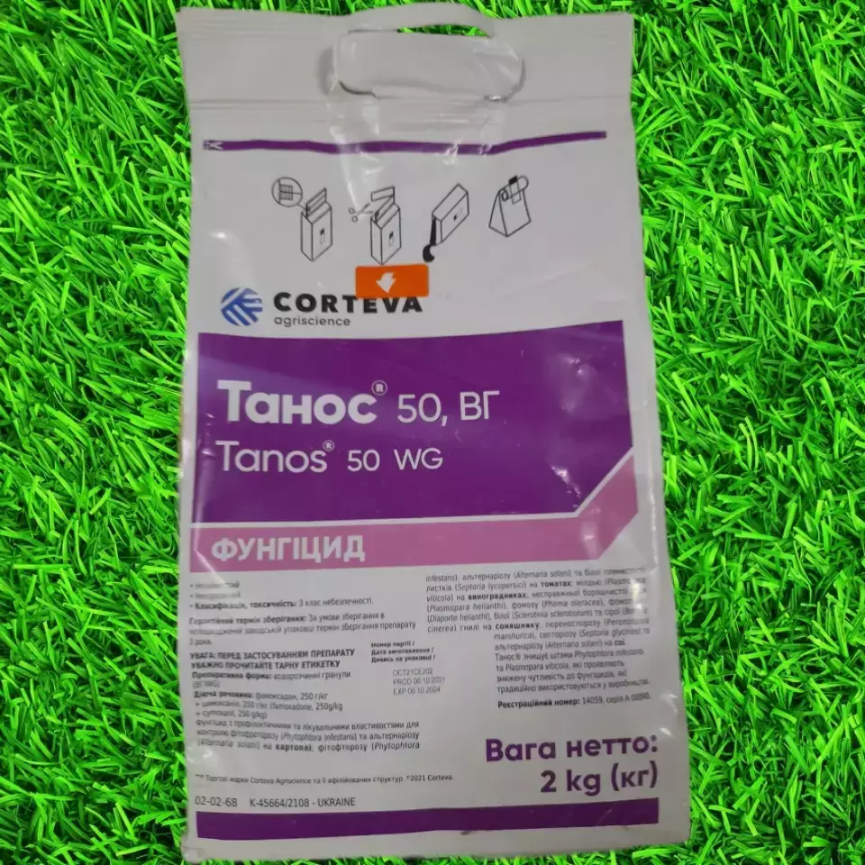 Танос є фунгіцидом, що містить дві біологічно-активних діючих речовини: 25% цимоксанілу та 25% фамоксадону.