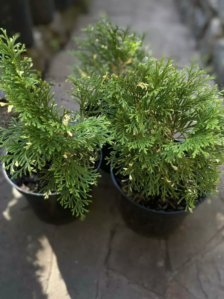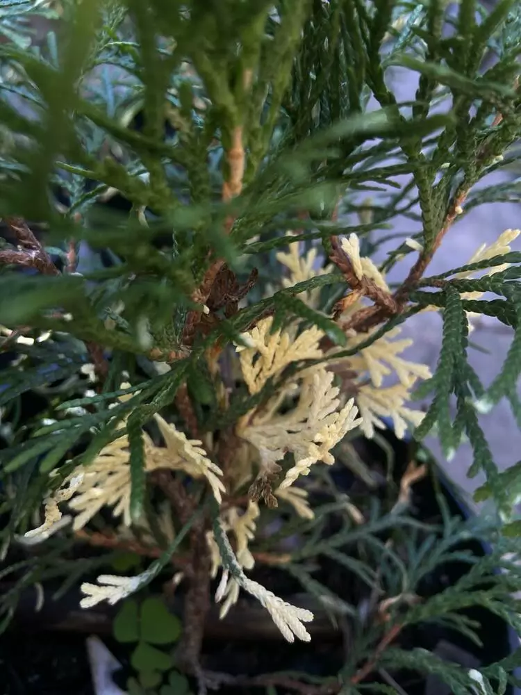Хвоя: лускатна. Пагони розташовані у вертикальній площині , насичено-зелені протягом усього року. Кінчики пагонів з білими цятками.