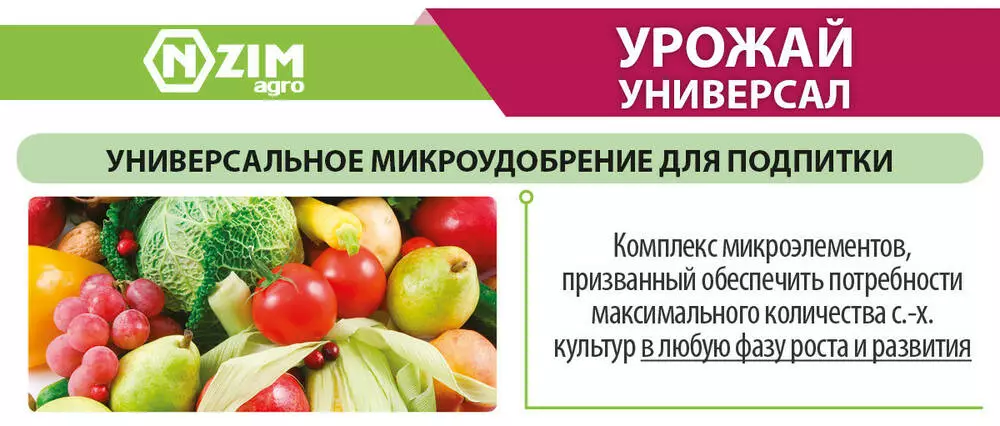 Урожай Універсал ENZIM Agro - комплекс мікроелементів, покликаний забезпечити потреби максимальної кількості сільськогосподарських культур в будь-яку фазу росту і розвитку. Крім необхідних мікроелементів, у комплекс включені високі кількості макроелементів Азоту, Фосфору і Калію, що підсилюють засвоєння і проникнення мікроелементів в рослину.